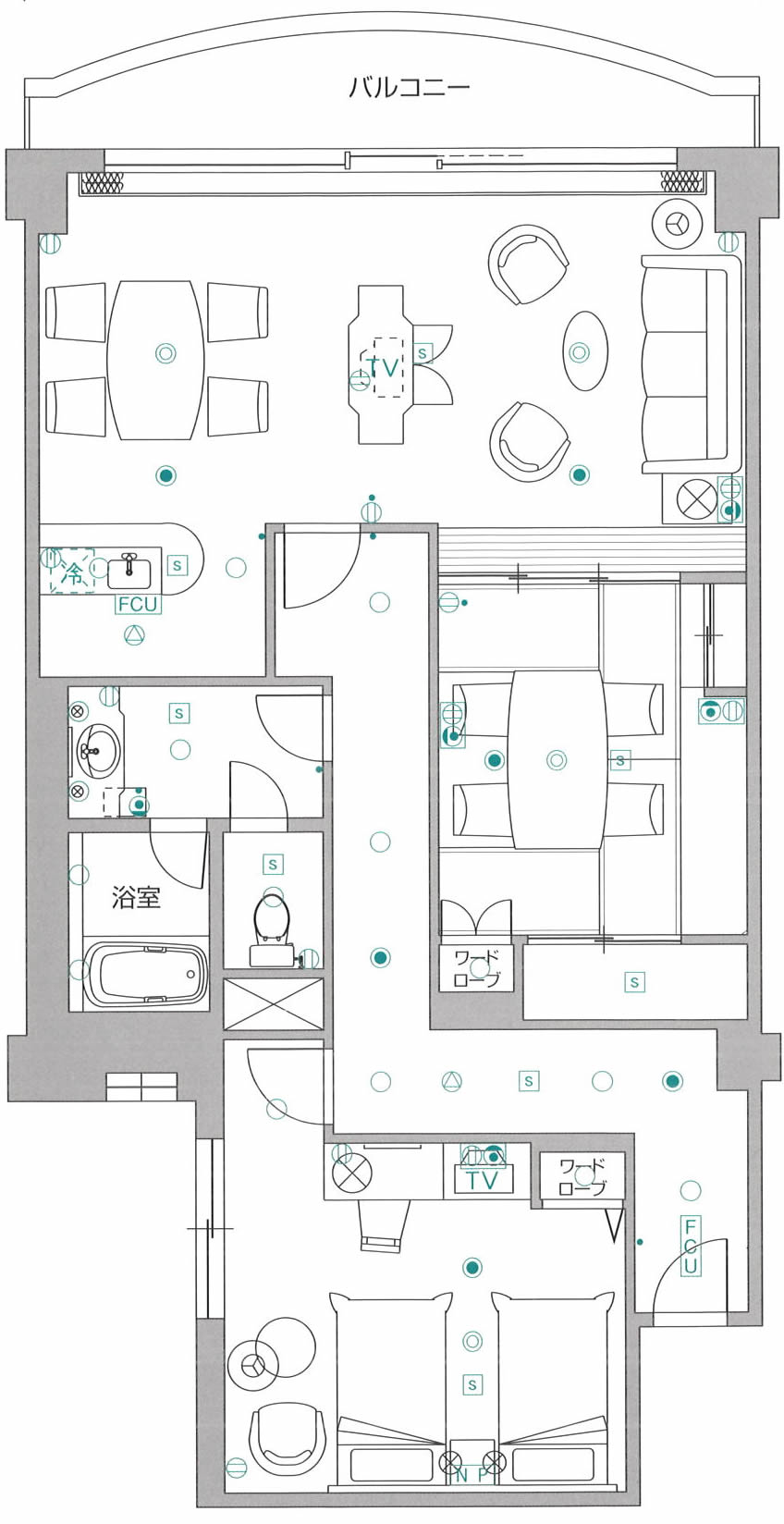 海側のリビングルームは、ソファースペースとダイニングスペースに分かれていて、一般のリゾートホテルのスイートタイプの間取りになっています。